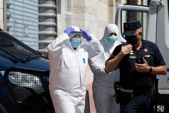 MALAGA, SPAIN - JUNE 26: Two health members arrive for a transfer to the Red Cross Reception, Emergency and Referral Center, where the Health Council of the Andalusian Government has detected a coronavirus outbreak on June 26, 2020 in Malaga, Sp...Daniel Perez Garcia-Santos via Getty Images