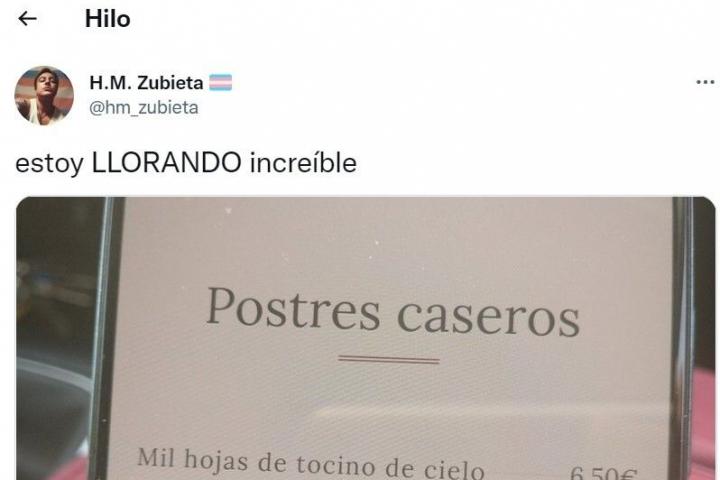 Eso es lo que le ha pasado a la usuaria @hm_zubieta. La joven ha compartido en redes sociales una imagen de la carta de postres caseros que tiene un restaurante español.