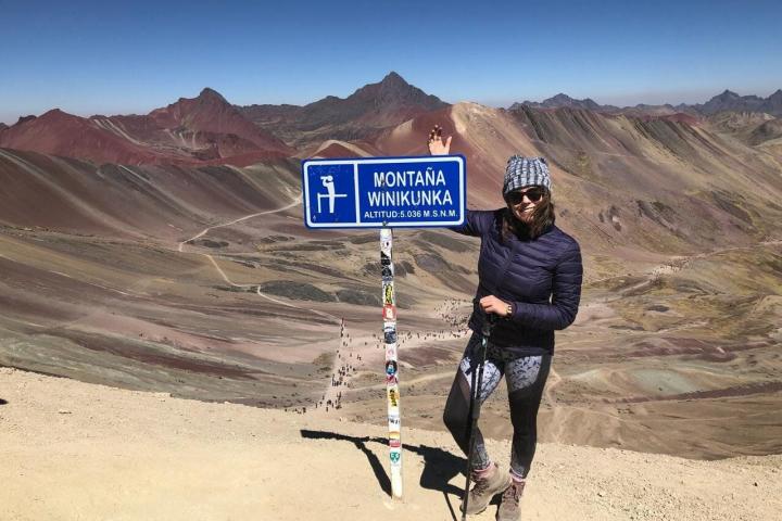 La autora en la cima de la montaña de colores en Perú.