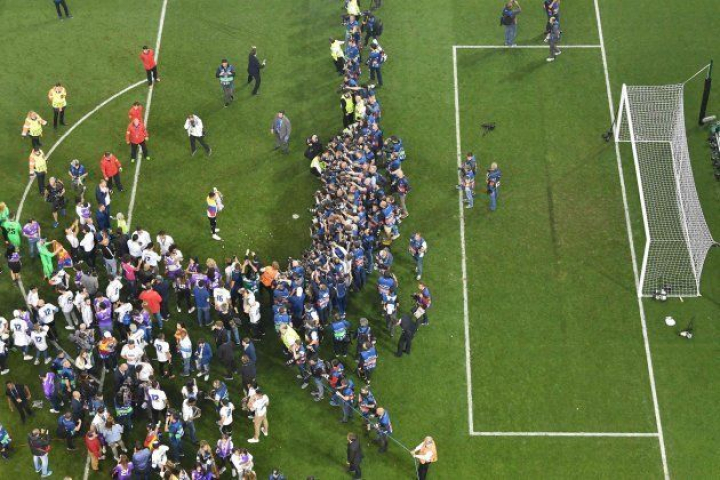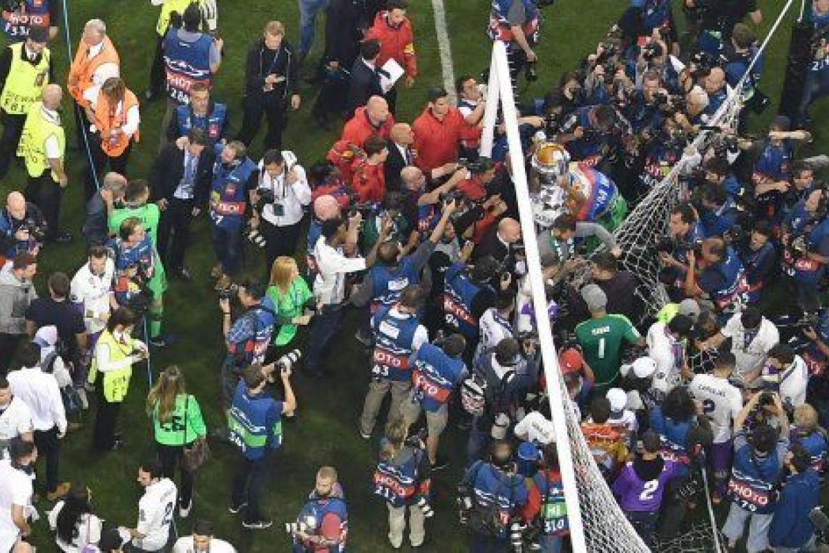 La organización permitió que los fotógrafos saltasen al césped y los jugadores no pudieron celebrar en condiciones la victoria porque estaban rodeados de fotógrafos, como se puede ver en la imagen: