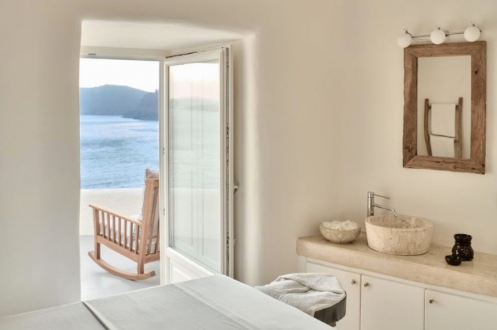 El hotel dispone de 41 suites y villas que ofrecen vistas panorámicas al volcán activo y a las aguas cristalinas del mar Egeo, y que han sido excavadas en los acantilados de Caldera de Oia.