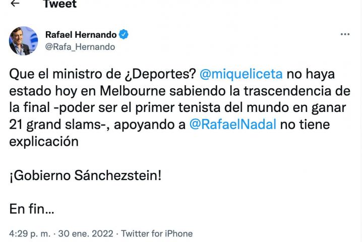 “Que el ministro de ¿Deportes? @miqueliceta no haya estado hoy en Melbourne sabiendo la trascendencia de la final -poder ser el primer tenista del mundo en ganar 21 grand slams-, apoyando a @RafaelNadal no tiene explicación ¡Gobierno Sánchezstein! En fin…”, escribió Hernando en Twitter.