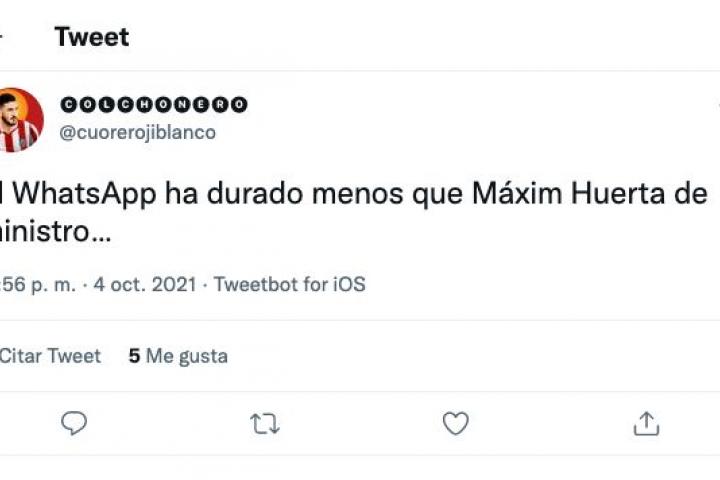 Cuando WhatsApp estaba recuperando el servicio, con idas y venidas cerca de la medianoche, el usuario @cuorerojiblanco quiso hacer una broma al publicar: “El WhatsApp ha durado menos que Máxim Huerta de ministro…”