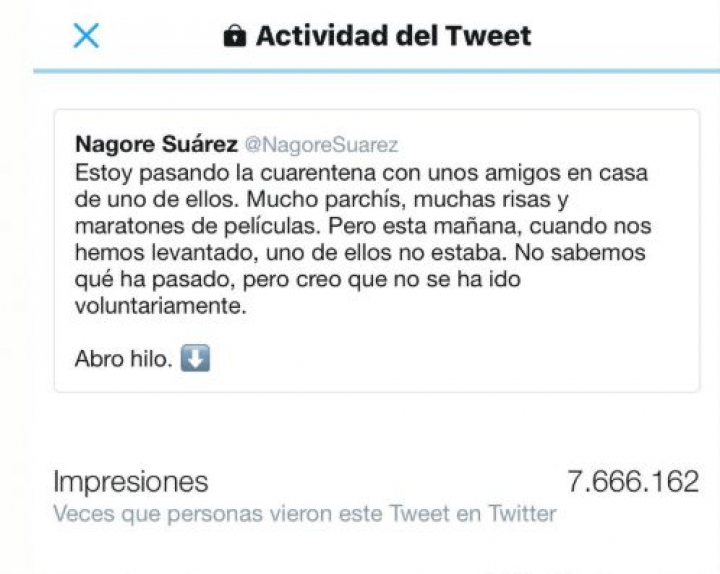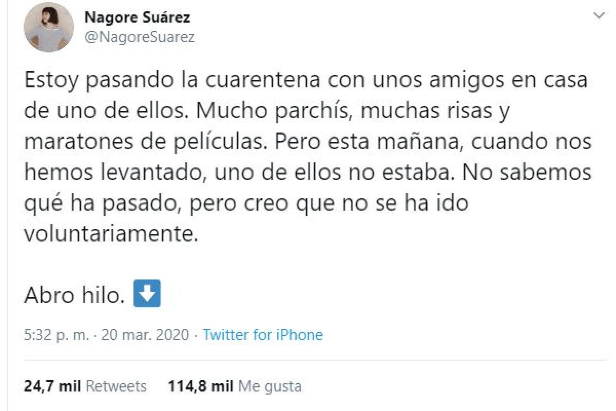 “Estoy pasando la cuarentena con unos amigos en casa de uno de ellos. Mucho parchís, muchas risas y maratones de películas. Pero esta mañana, cuando nos hemos levantado, uno de ellos no estaba. No sabemos qué ha pasado, pero creo que no se ha ido voluntariamente. Abro hilo”, así ha sido el inicio de la historia de misterio que ha mantenido en vilo a miles de personas en Twitter el pasado fin de semana y que alcanza ya más de 7,5 millones de impresiones.