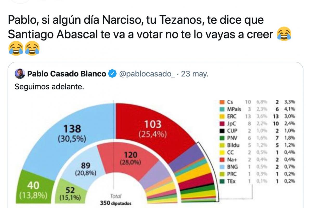 La cuenta oficial de Vox en Twitter ha compartido un tuit de Pablo Casado con un barómetro de la empresa de Michavila para el diario ABC en la que observa que el Partido Popular arrasa en intención de voto con un 30,5% y 138 escaños, 49 más que en las últimas generales.