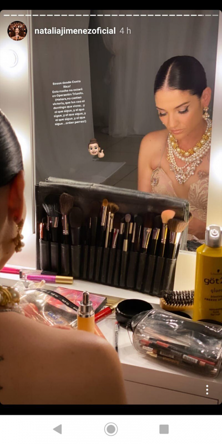 Jiménez aprovechó la ocasión para enviar, a través de sus ‘stories’, un mensaje a sus críticos: ”Esta noche no estaré en Operación Triunfo. (Haters, no canten victoria, que los veo el domingo que viene y el que sigue, y el que sigue, y el que sigue, y el que sigue y el que sigue... ¡andan perras!)”.