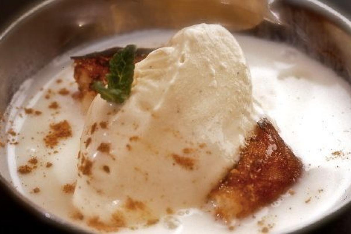 Pasar 4 cucharadas de natillas a un cuenco. A continuación, la torrija caramelizada y templada y por último una cucharada grande en forma de quenelle de chantilly. Espolvorear con canela molida y azúcar glace.