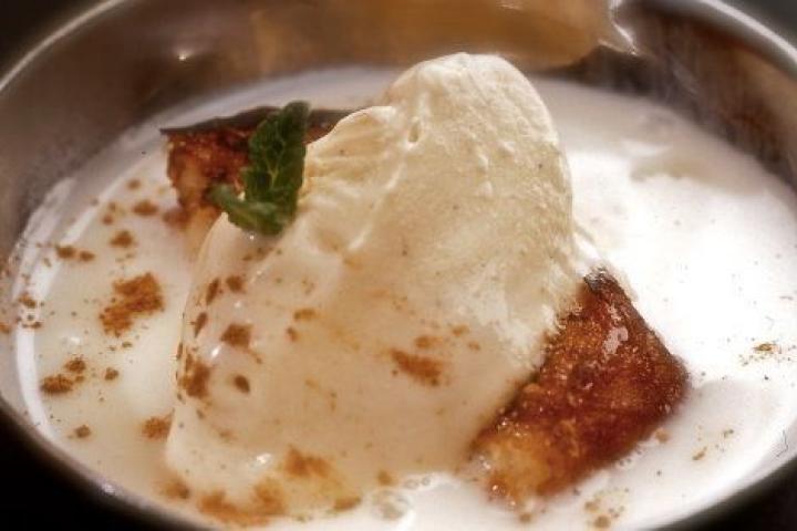 Natillas, torrija y chantilly de piña