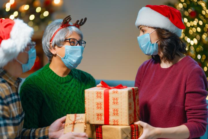 People with gifts wearing facemasks during coronavirus and flu outbreak on Christmas. Virus and illness protection, home quarantine. COVID-2019Choreograph via Getty Images