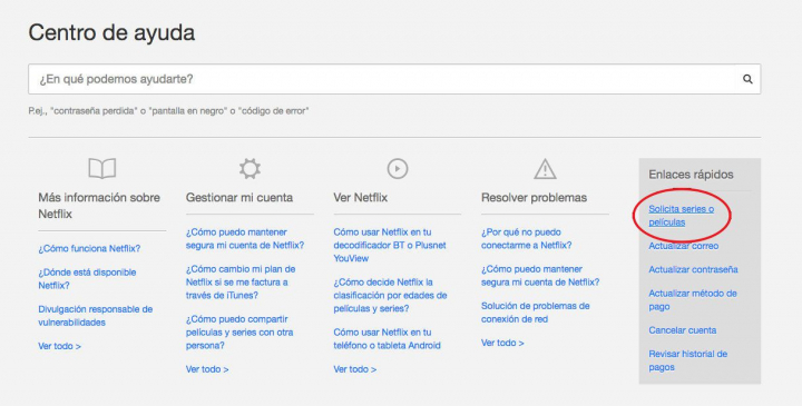 Una vez en la nueva pantalla, hay que ir a la columna de la derecha y pinchar en Solicita series o películas, la primera del cuadro gris titulado Enlaces rápidos.
