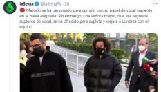 Casualidades o no, la segunda suplente de vocal, “una señora mayor” se ha ofrecido voluntaria para sustituir al lateral madridista para que este pudiera viajar con su equipo a Londres. Marcelo, no la señora, como se ha bromeado durante todo el día en las redes sociales.