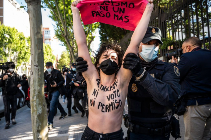 Uno de los pocos momentos de tensión en una jornada felizmente tranquila después de una campaña tan agresiva. Varias activistas de FEMEN han protestado con el torso desnudo a las puertas del colegio electoral que le correspondía a la candidata de Vox, con gritos como ”¡Es fascismo, no es patriotismo!” y ”¡al fascismo, ni voto ni permiso!”.