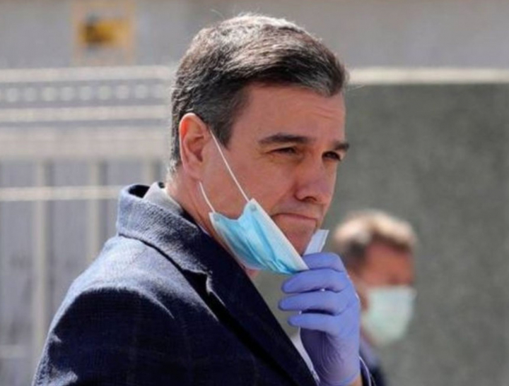 Tampoco el presidente Pedro Sánchez lo hizo bien este día. Los guantes no dan superpoderes. Son como las manos y pueden también estar contaminados con esas gotículas. No se puede apartar la mascarilla de esta forma. Pedro, así no.