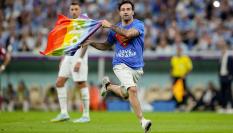 Este lunes en el minuto 50 del partido Portugal - Uruguay del Grupo H del Mundial de Qatar tuvo lugar uno de los momentos que muchos espectadores esperaban: un espontáneo saltó al campo con una bandera arcoíris para protestar sobre la falta de respeto a los derechos humanos en el país anfitrión.