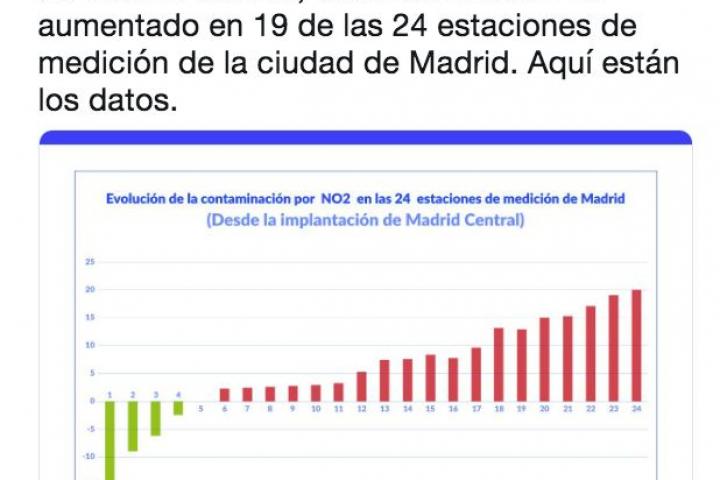 Lo hizo en Twitter, desde su cuenta oficial, donde compartió un gráfico sobre la evolución de la contaminación en las estaciones de Madrid desde la implantación de Madrid Central.