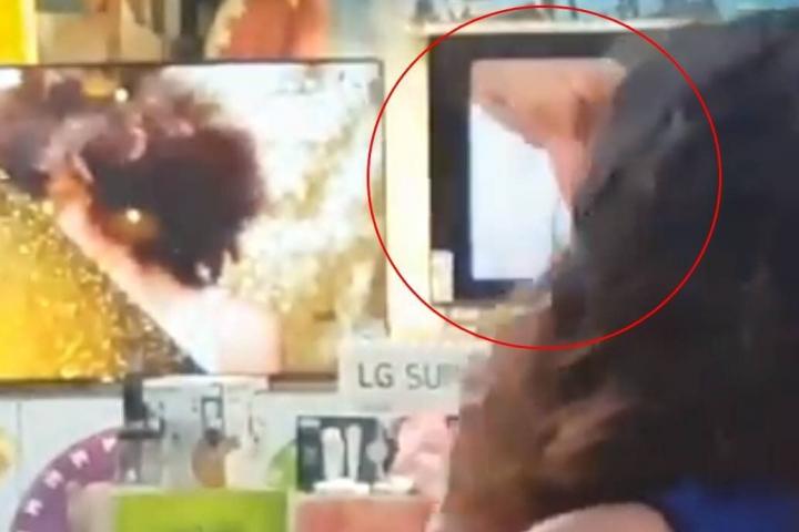 Los transeúntes no tardaron en percatarse del cambio de programación en el escaparate y comenzaron a grabar y a compartir lo sucedido en redes sociales.