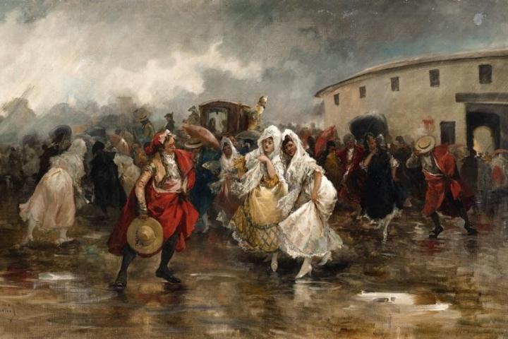 Seguramente esta idea está muy lejos de la intención con la que Eugenio Lucas Villaamil pintó en 1885 su Tarde de toros, lluvia. Una obra ambientada en un Madrid castizo, protagonizado por majas y chisperos. Representa una escena de las llamadas “galantes”, en la que el espacio principal lo ocupan dos majas que son “lisonjeadas” por un joven, que parece tener la clara intención de conseguir un favor o ganar su voluntad con una invitación protectora.