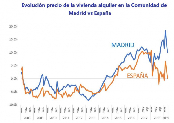 En esta gráfica se puede ver la diferencia existente en los alquileres entre la Comunidad de Madrid y el conjunto de España: