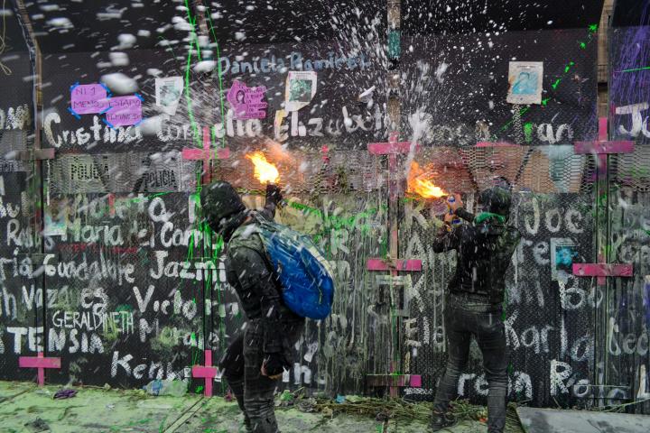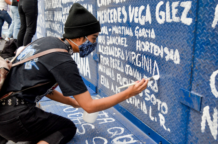 Dos chicas escriben más y más nombres con pintura blanca que resalta en el negro de la lámina del muro que resguarda el Palacio Nacional, hogar del presidente de México, Andrés Manuel López Obrador.