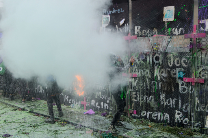 Al llegar al Zócalo, las mujeres fueron repelidas con bombas de gas lacrimógeno, acción que el gobierno de la Ciudad de México insiste en negar.
