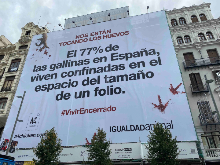 El misterio se resolvió cuando el jueves 5 de noviembre desplegamos una segunda lona con un no menos contundente mensaje: “El 77% de las gallinas en España pasan su vida confinadas en el espacio del tamaño de un folio” #VivirEncerrado.