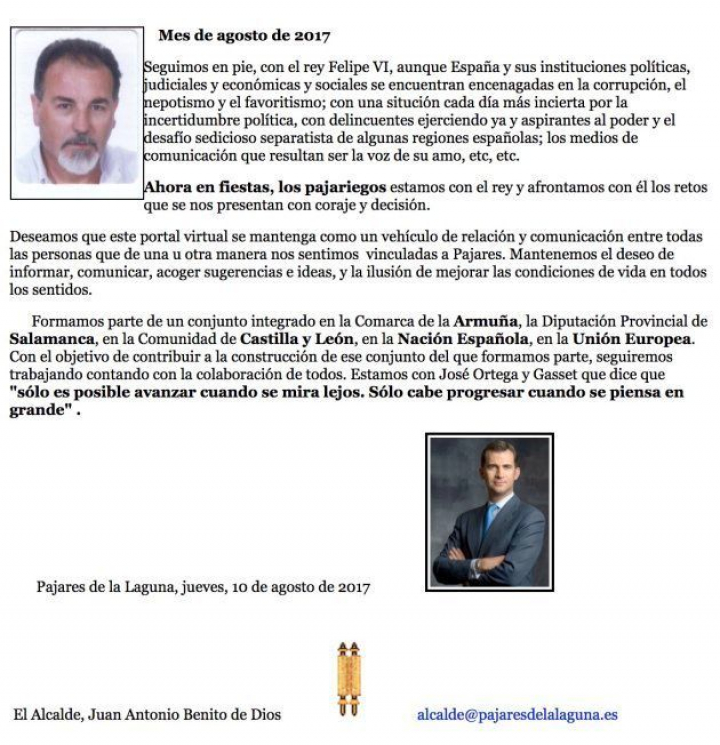 Juan Antonio Benito de Dios da la bienvenida a todos los visitantes a su web municipal con un breve pero intenso mensaje publicado en agosto de 2017 en favor del rey Felipe VI, que sin duda agradecerá el gesto del edil popular.
