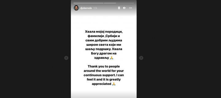 Mientras, Djokovic sigue en el hotel atento a las novedades. Llevaba días sin posicionarse en sus redes y este viernes lo ha hecho con un breve story en su Instagram, donde agradece los apoyos: “Gracias a la gente de todo el mundo por su apoyo continuo. Lo puedo sentir y lo agradezco mucho”.