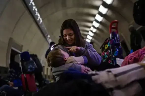Lena, de Kiev, cuida de un niño llamado Max, de 3 años, en una estación de metro en la que se están refugiando los civiles ucranianos de los ataques rusos.MARCUS YAM VIA LOS ANGELES TIMES VIA GETTY IMAGES
