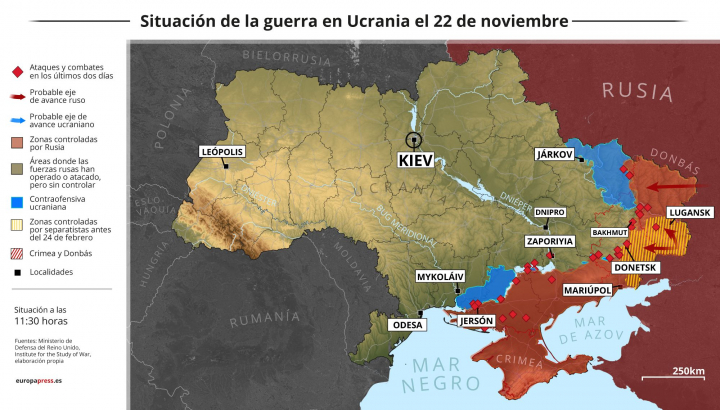 El último mes de contienda ha sido muy movido. Ucrania ha recuperado Jersón, la primera gran ciudad tomada por los rusos, al inicio justo de su “operación militar especial”, punta de lanza de su contraofensiva. Tras los éxitos de primero del verano y el relanzamiento de septiembre, ahora se ha apuntado este tanto que es importante en lo estratégico y esencial en lo anímico. Kiril Tymoshenko, jefe de gabinete del presidente ucraniano, Volodimir Zelenski, ha afirmado esta semana que han liberado 77.700 kilómetros cuadrados de país, lo que supone un 52% de lo invadido por Rusia en estos meses. Un buen dato, que nadie esperaba con las diferencias entre los dos ejércitos, logrado por la resiliencia local -militar y civil-, el apoyo exterior y los fallos propios de Moscú, pero que no puede ocultar que Rusia sigue ocupando otros 119.900 kilómetros cuadrados, esto es, un poco menos del 20% del país.