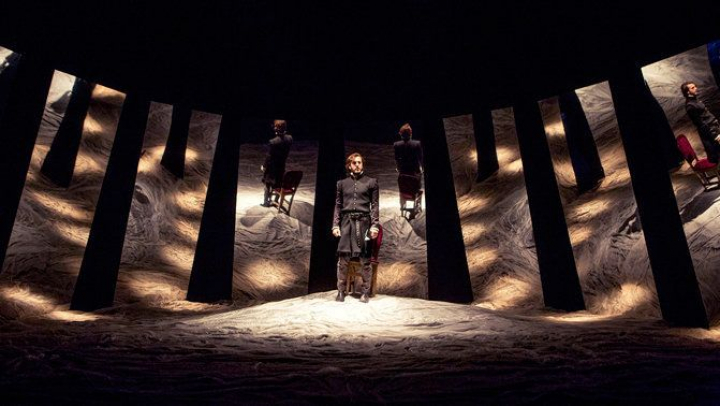 En esta versión de Hamlet no se ven grandes tronos ni emblemáticas estancias propias de la realeza. Ocho espejos y suelos gaseosos y cambiantes que van marcando los tiempos de la obra son suficientes para renovar una historia muy manida.