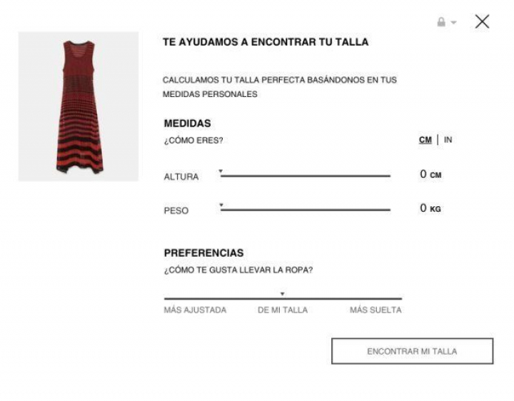 Además, en muchos artículos encontrarás un asistente que calcula cuál es la talla más apropiada para ti insertando tus medidas. Al pinchar en la pregunta ¿Cuál es mi talla? se despliega una pantalla en la que se puede indicar la altura, el peso e incluso cómo se prefiere llevar la prenda: si ajustada, normal o suelta.