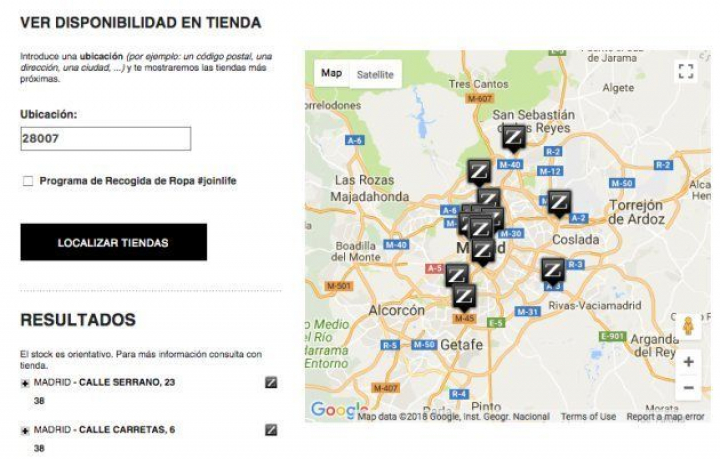 Si pinchas podrás introducir tu talla y teclear tu código postal, una dirección o una ciudad para saber en cuáles de las tiendas más cercanas está disponible la prenda.