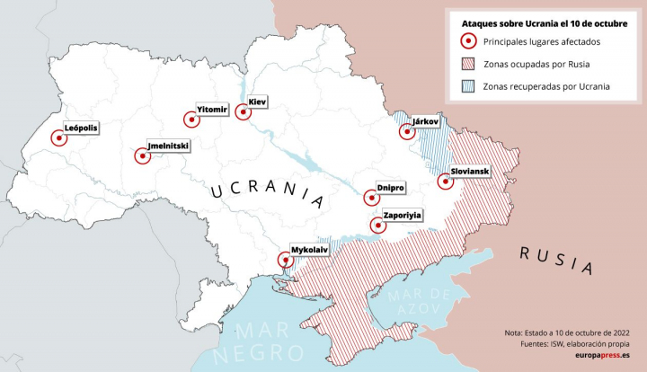 Según el último informe del Instituto para el Estudio de la Guerra (ISW), los ataques rusos del 10 de octubre desperdiciaron algunas de las armas de precisión “cada vez más escasas” contra objetivos civiles y que, a diferencia de lo que dice el mando de que se atacaron centros de comando militar, las redes sociales muestran que eso no es así.