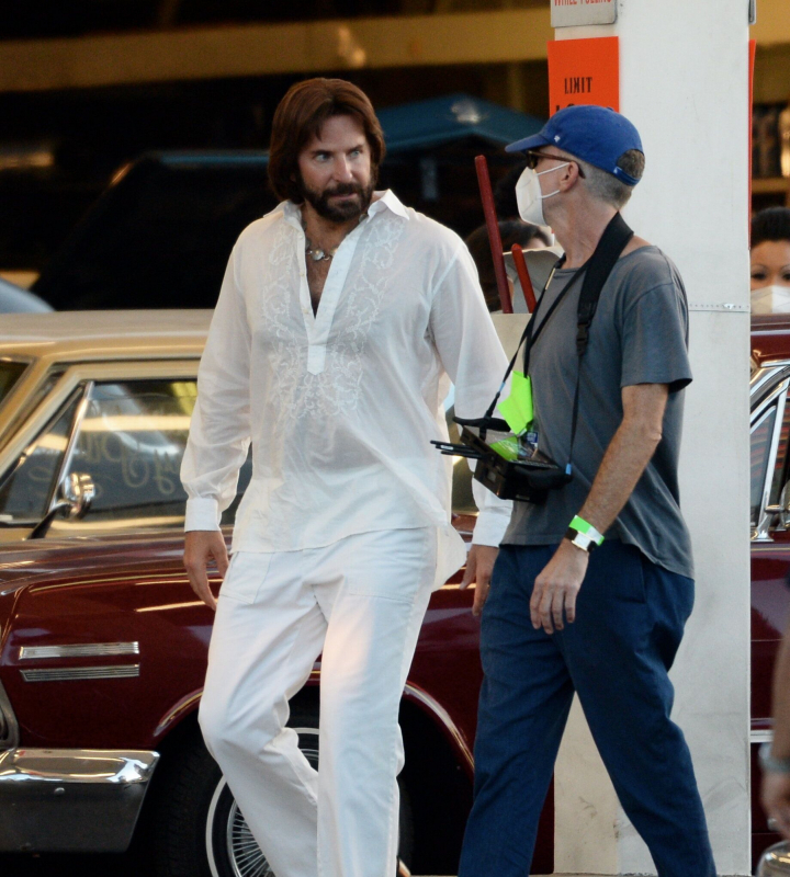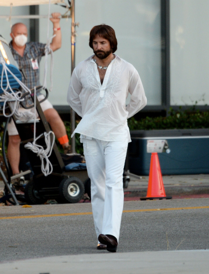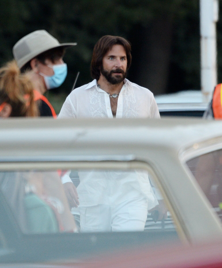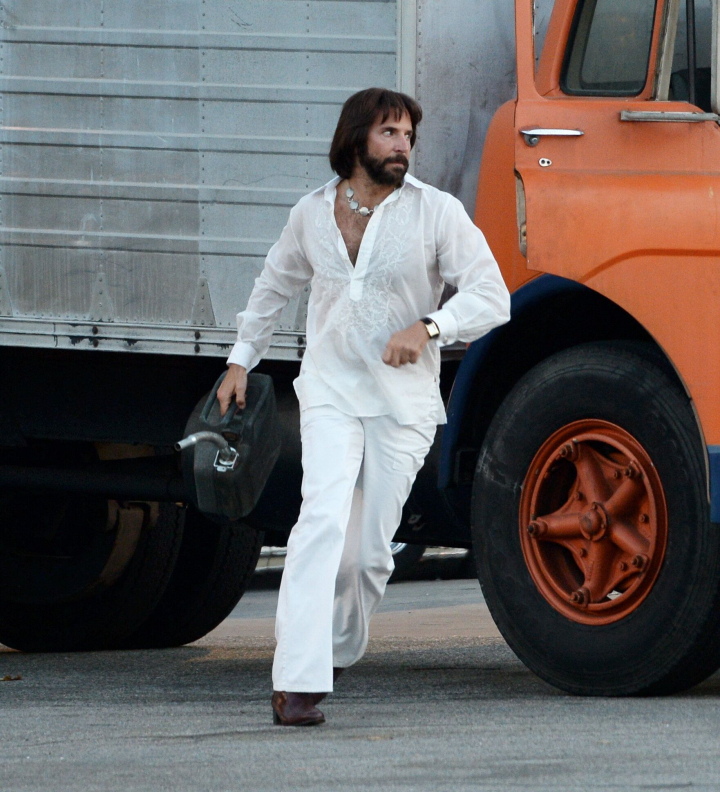 Cooper aparece en las fotos con barba espesa, pelo largo liso y vestido totalmente de blanco, con camisa abierta hasta la mitad del pecho para que se le pueda ver bien el collar que luce. Una imagen que muy poco tiene que ver con la de la película de David O. Russell pero que encaja con el estilo hippie de la época.