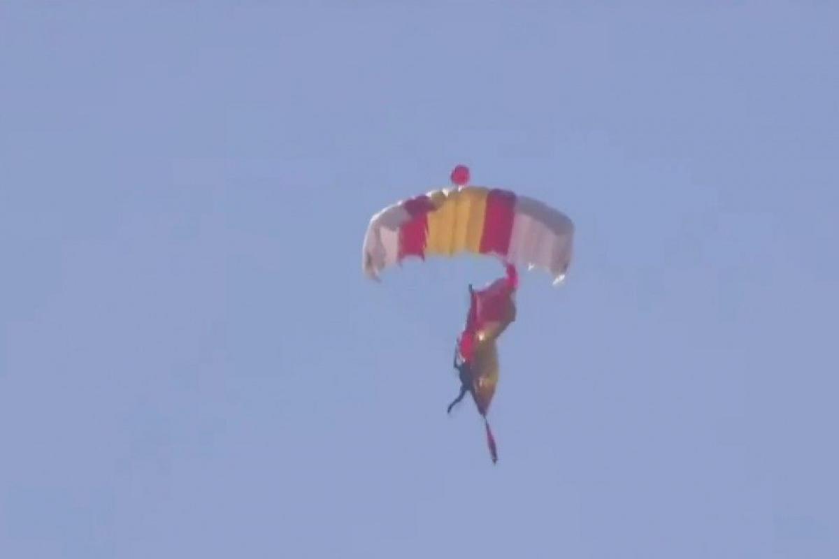 El aterrizaje ha culminado con éxito, aunque para ello el militar ha tenido que solucionar en el aire un problema con la bandera, que se le ha enrollado en el cuerpo antes de desplegarse por completo.