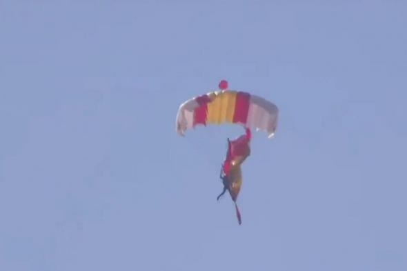 El aterrizaje ha culminado con éxito, aunque para ello el militar ha tenido que solucionar en el aire un problema con la bandera, que se le ha enrollado en el cuerpo antes de desplegarse por completo.