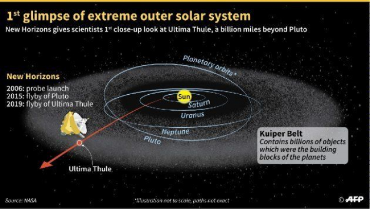 Ultima Thule, cuyo nombre fue elegido por el público en una convocatoria de la NASA (hasta entonces era conocido como 2014 MU69), está ubicado en una de las regiones más remotas del Sistema Solar, conocida como el cinturón de Kuiper, a unos 6.500 millones de kilómetros de distancia del Sol.