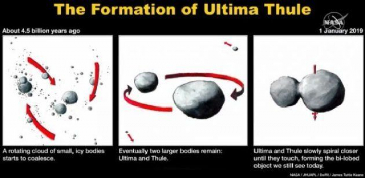 Con un modelo de arcilla sobre la mesa de Ultima Thule, el jefe de geofísica y geología de la misión, Jeff Moore ha explicado que el objeto empezó a formarse hace unos 4.500 millones de años, cuando una nube giratoria de pequeños cuerpos helados empezaron a fusionarse y dieron lugar a Ultima y a Thule.