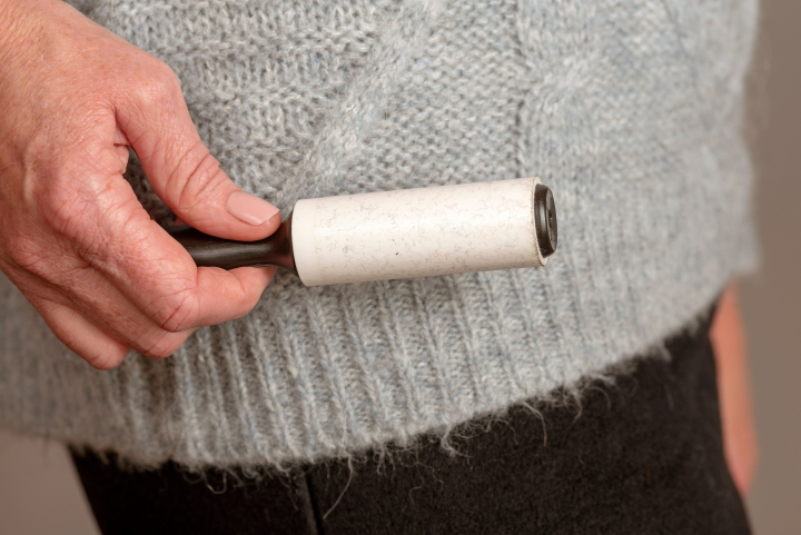 Los rollos de cinta adhesiva para limpiar la ropa son muy útiles para retirar el pelo de los animales de cualquier prenda. También se pueden usar en los muebles tapizados. En caso de no disponer de estos rollos de cinta, se consigue el mismo efecto con cinta adhesiva ancha o cinta aislante, que cunden más cuando se trata de superficies grandes.
