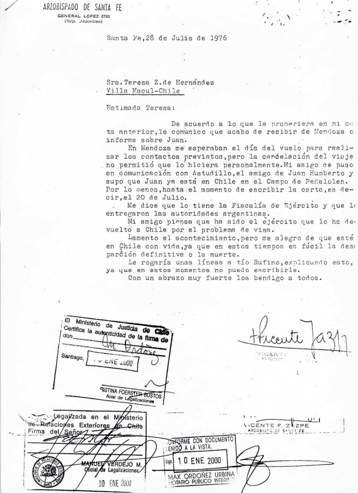 A través de un primo que era arzobispo de Santa Fe, la familia supo que Juan fue “tomado por la Policía argentina y entregado al Ejército chileno”, y que lo tenían en el campo de concentración de Villa Grimaldi, en Peñalolén, uno de los mayores centros de detención y tortura de la dictadura chilena.