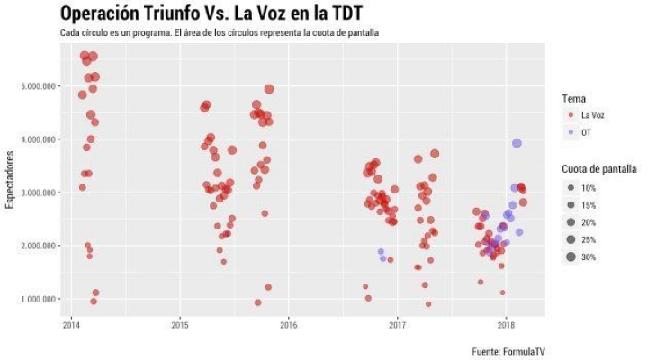 Lo primero que llama la atención de los datos de audiencia de OT es que por lo general no superan a los de La Voz. De hecho, si los comparamos con La Voz Kids (2014) no se entiende el porqué de tanto ruido con Operación Triunfo: la mayoría de los episodios de esta edición de La Voz superaron en espectadores y cuota de pantalla a los de la edición de 2017 de OT. De hecho, el estreno de La Voz Kids (2018) hace unos días tuvo una audiencia mayor que casi todos los programas de OT (3.118.000 millones de espectadores).