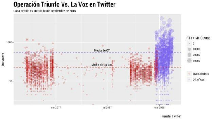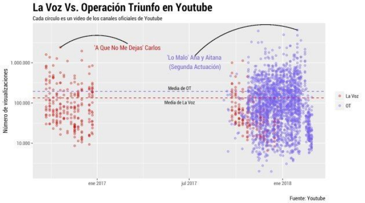 Frente a los 55 millones de reproducciones totales y los 90.580 suscriptores del canal de La Voz España (desde 2016) Operación Triunfo ya acumula 426 millones de reproducciones (desde 2017) y más de 392.000 seguidores. Sin embargo, hay una explicación parcial a la diferencia tan brutal en las visualizaciones totales: OT ha subido el doble de videos que La Voz. La media de visualizaciones por video del programa de TVE es aun así superior a la de La Voz: 194.121 frente a 133.742.