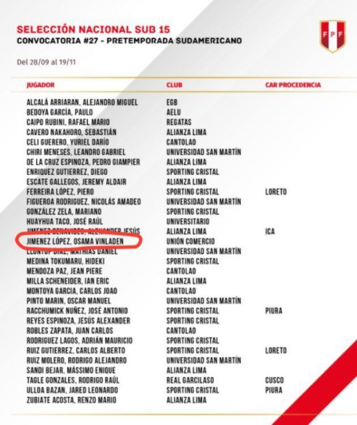 La Federación Peruana de Fútbol ha dado la sorpresa del día en las redes sociales al publicar la lista previa de los jugadores que optan a representar a su país en el campeonato sudamericano sub15, que se disputará en Argentina. ¿Qué tiene de llamativo? Pues el nombre de uno de los jugadores: Osama Vinladen Jiménez López. Sí, lees bien: como Osama Bin Laden, el líder del grupo terrorista Al Qaeda, pero con v y uniendo las dos palabras del apellido original.
