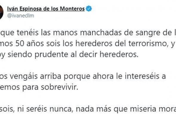 La réplica de Espinosa de los Monteros fue muy dura: “Los que tenéis las manos manchadas de sangre de los últimos 50 años sois los herederos del terrorismo, y estoy siendo prudente al decir herederos. No os vengáis arriba porque ahora le intereséis a Podemos para sobrevivir. No sois, ni seréis nunca, nada más que miseria moral”.