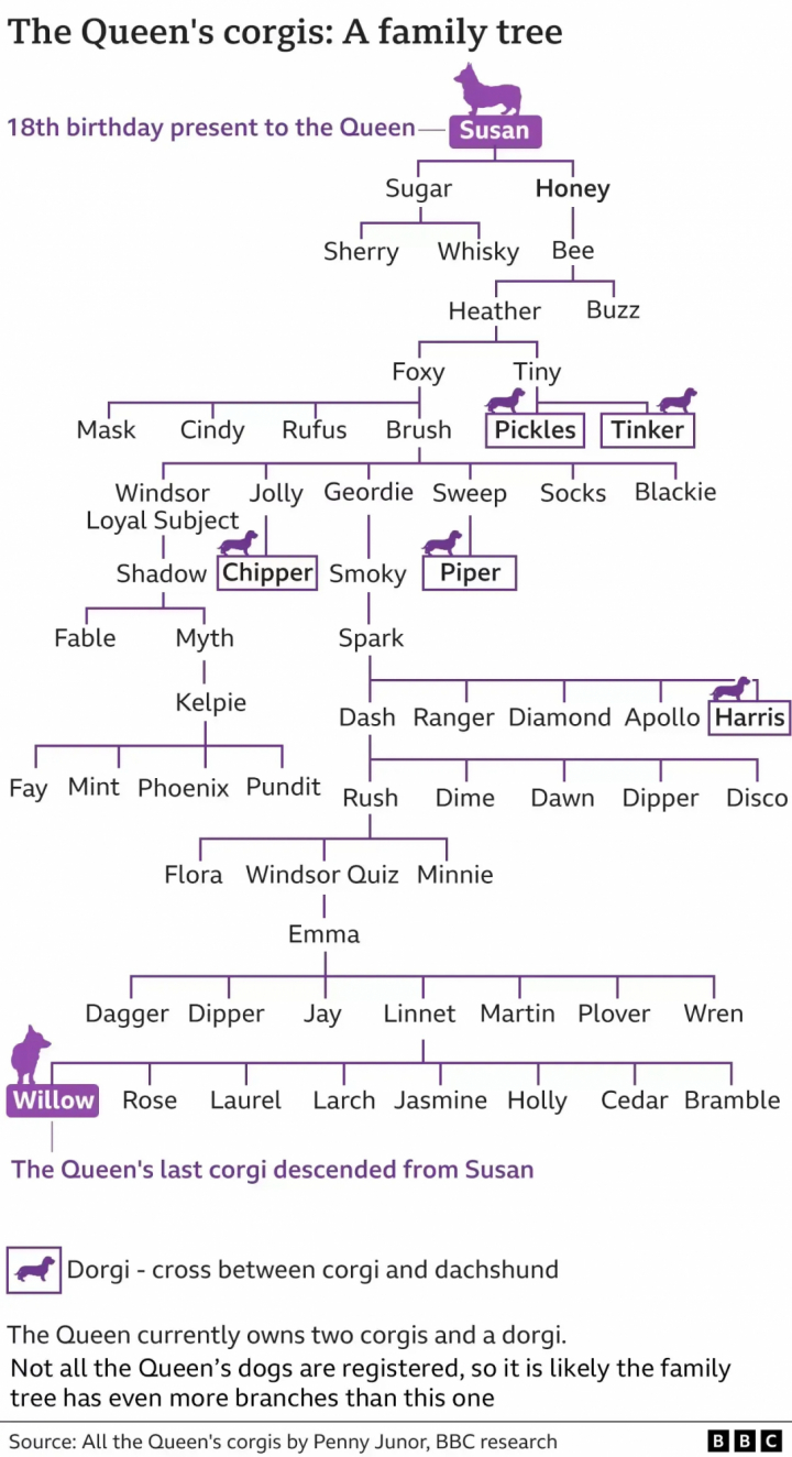 En el esquema distribuido por la BBC, se comprueba el extenso linaje de estos animales hasta el últimos de ellos, Willow, que falleció el pasado 2018.