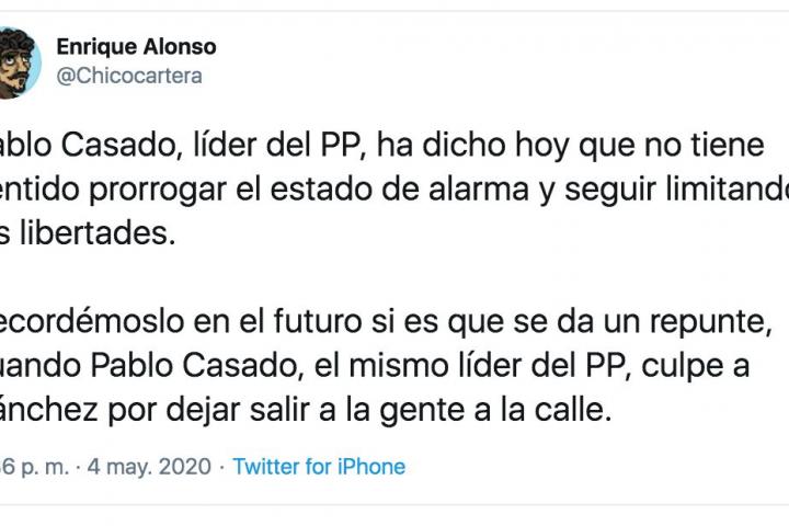 21:36 horas del 4 de mayo de 2020. El usuario de Twitter Enrique Alonso (@Chicocartera) escribe el siguiente mensaje en su cuenta sobre Pablo Casado y sus declaraciones de entonces sobre el estado de alarma por el coronavirus: