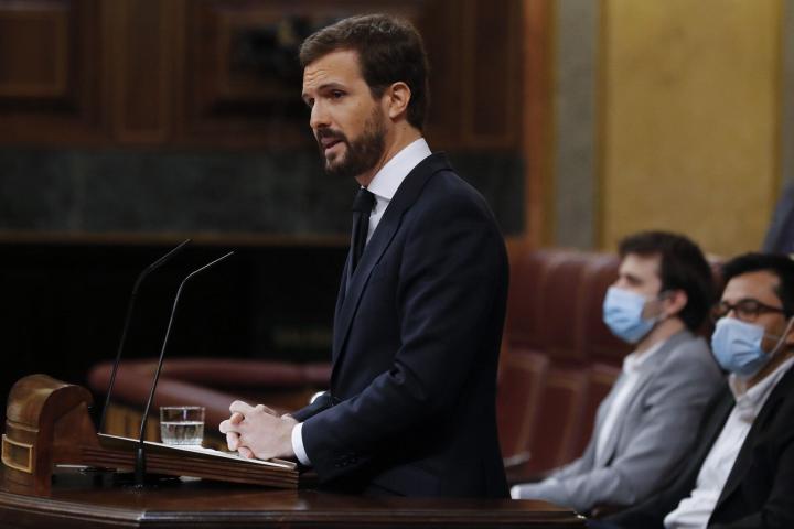 El líder del PP, Pablo Casado, ha reiterado este miércoles su ‘no’ a la quinta prórroga del estado de alarma. Los 89 diputados populares votarán contra el plan del Gobierno, junto a los independentistas de ERC y la ultraderecha de Vox. “Sería una irresponsabilidad ayudarle a prorrogar 15 días más”, ha asegurado el líder de la oposición, quien ha recalcado que la excepcionalidad se ha convertido en “un agujero negro” en las libertades públicas.