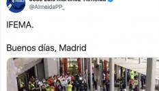 Casado ha compartido las imágenes de su visita en su cuenta de Twitter, donde se ha referido al momento en el que ha visto cómo daban el alta a un hombre que salía del hospital en silla de ruedas: “Es emocionante ver el alta de un paciente en Ifema, el lugar donde hace 16 años comencé a trabajar en los servicios de emergencia por el atentado del 11M, desde la Consejería de Interior donde conocía a Isabel Díaz Ayuso. Madrid es símbolo de solidaridad y resistencia a las catástrofes”.