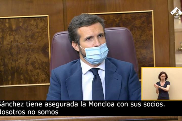 Una imagen de Pablo Casado este miércoles en el Pleno extraordinario celebrado en el Congreso ha hecho que algunos tuiteros se lleven las manos a la cabeza. Estos han capturado imágenes del líder del PP en su escaño con la mascarilla mal puesta.