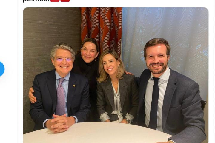 El presidente del PP, Pablo Casado, compartió este viernes en su cuenta de Twitter una fotografía en la que se le ve compartiendo mesa y mantel con Guillermo Lasso, presidente de Ecuador, de visita en España.